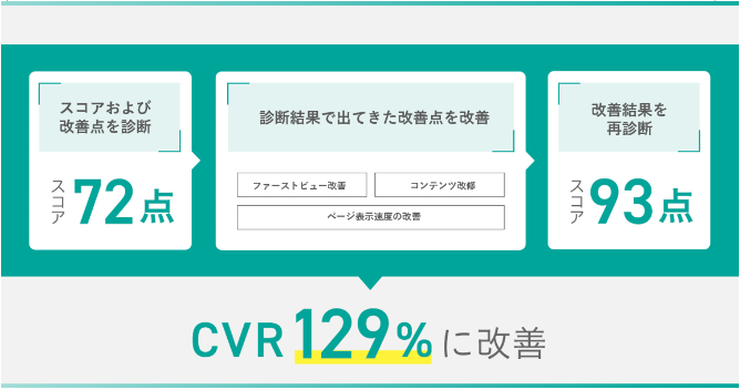 診断結果に基づいて、ファーストビューの改善、ライティングページ内のコンテンツ改修、ページ表示速度の改善などを行い、CVR(コンバージョン率)が129% に改善。