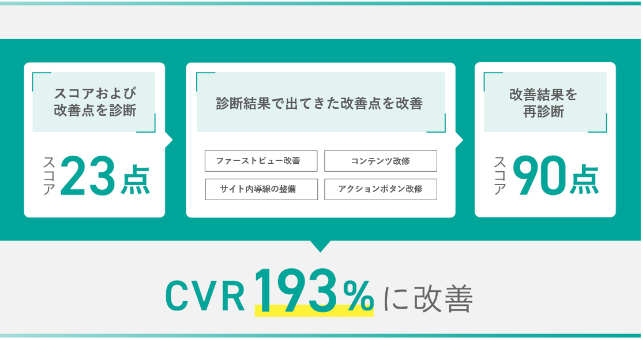 診断結果に基づいて、ファーストビューの改善、ライティングページ内のコンテンツ改修、サイト内導線の整備、アクションボタンの改修などを行い、CVR(コンバージョン率)が193 %に改善。