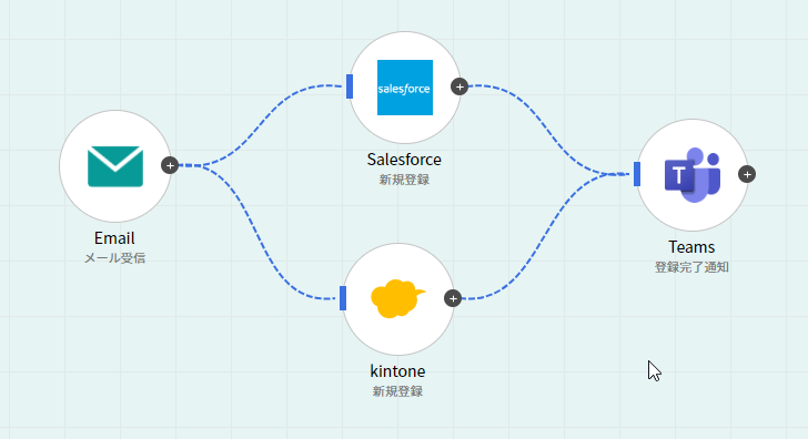 受信したメール内容をSalesforce、kintoneなどのシステムに自動で登録し、Teamsに通知。これによりSFA/CRMの自動登録が可能となり、作業完了の際にTeamsで通知を受け取ることで確認漏れを防ぎます。