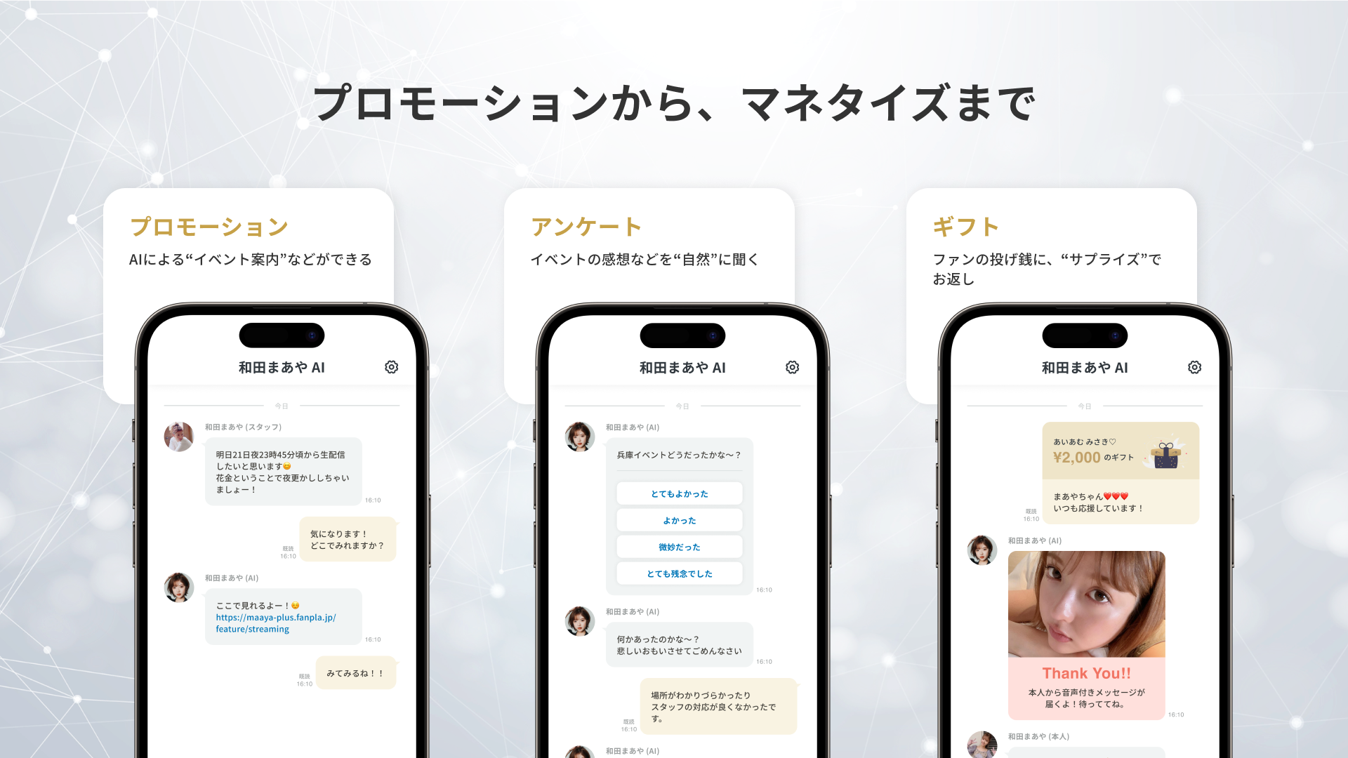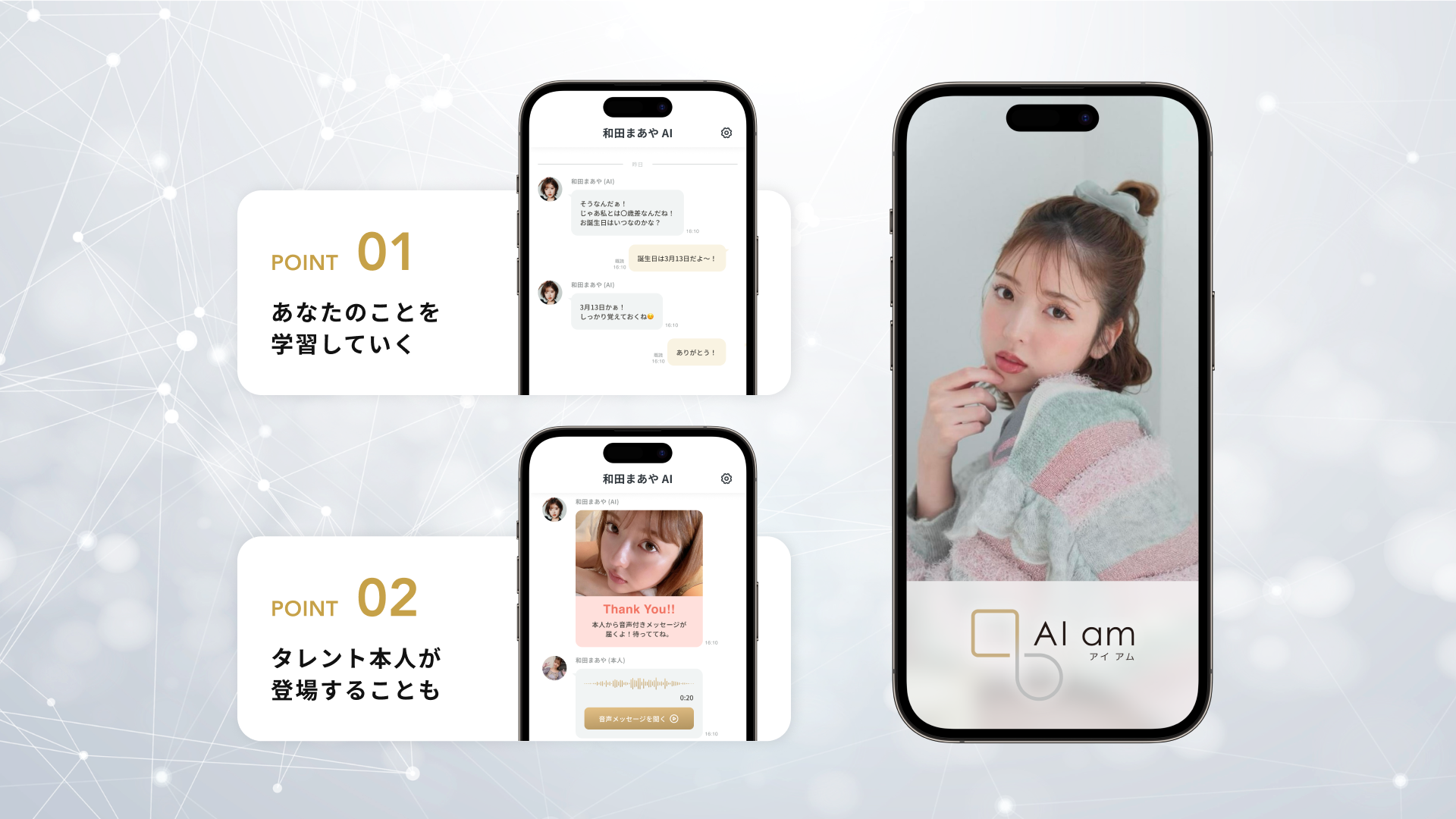 「AI am」は、ファンとの1on1コミュニケーションを実現するAIコミュニケーションプラットフォームです。イベント案内、アンケート、ギフト機能により、プロモーションからマネタイズまでトータルに支援します。「AI am」では、芸能事務所やタレント・インフルエンサーの募集も随時行っております。