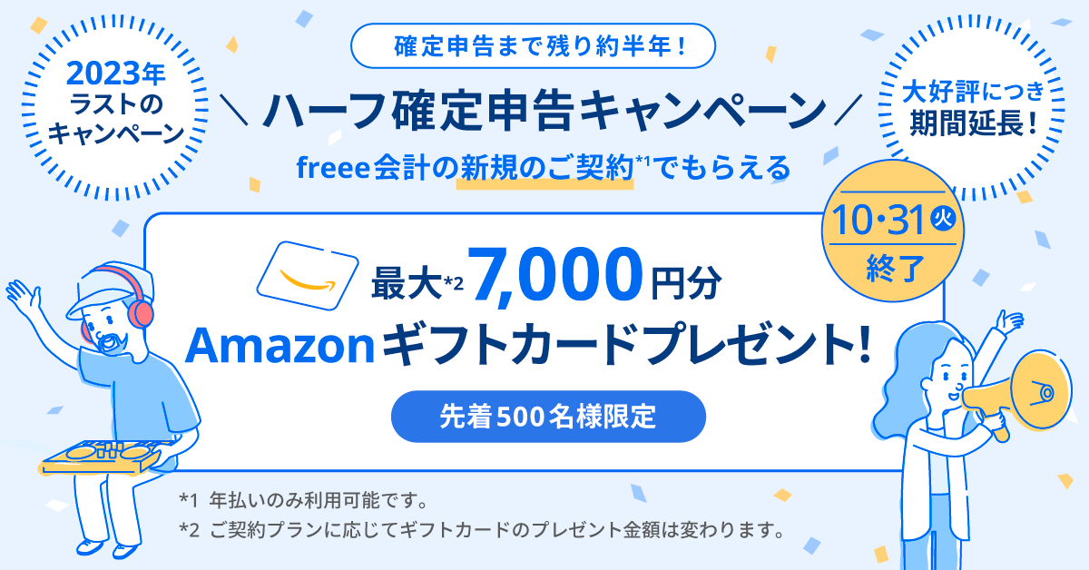 今回期間延長を発表した「ハーフ確定申告キャンペーン」は、確定申告に必要な機能が備わったfreee会計を契約するとAmazonギフトカードがもらえるキャンペーンです。2023年分の確定申告に向けて、半年分の領収書整理にお役立てください。