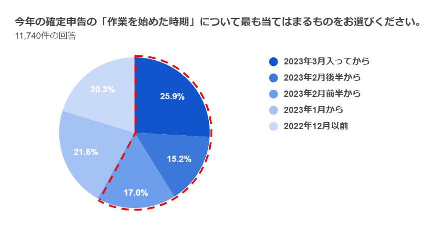■「確定申告の作業を始める時期」は直前が約6割!ギリギリの人ほど電子申告を活用できない!?