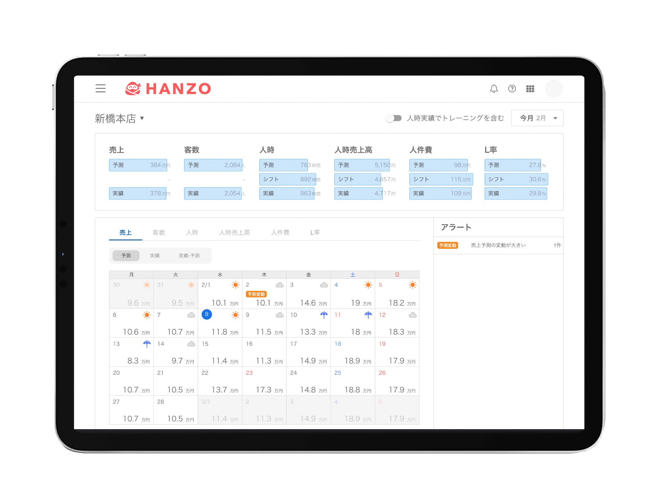 当社が提供する「HANZO」シリーズは飲食店において手作業で行われていた売上の予測や食材の発注量の計算、売上に対する最適な必要人員数の算出などをAIが自動で行い、バックヤード業務の負担を軽減するクラウドサービスです。