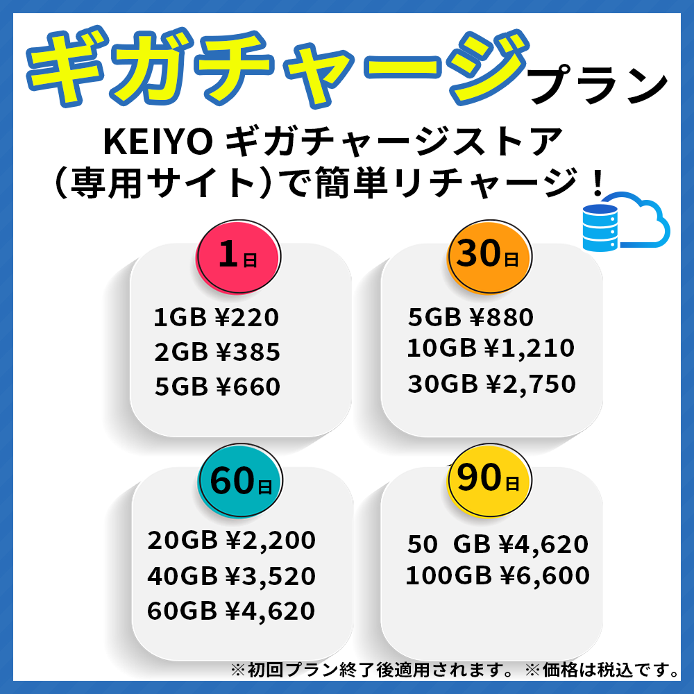 初回10GB/30日のデータ容量を使いきったら、KEIYOギガチャージストアでいつでもリチャージできます。