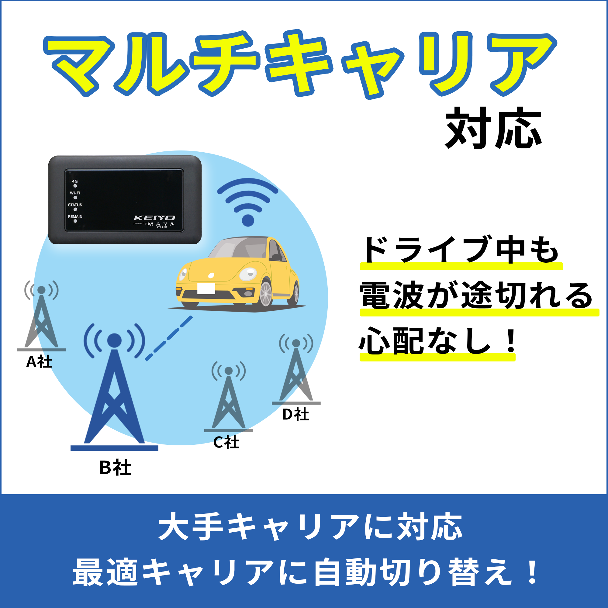 本製品はクラウドSIM型Wi-Fiルーターで、日本の大手キャリアにマルチキャリア対応しており、電波状況に応じて自動切換えを行います。4G(LTE)電波環境があれば、いつでもどこでもWi-Fi環境にできます。