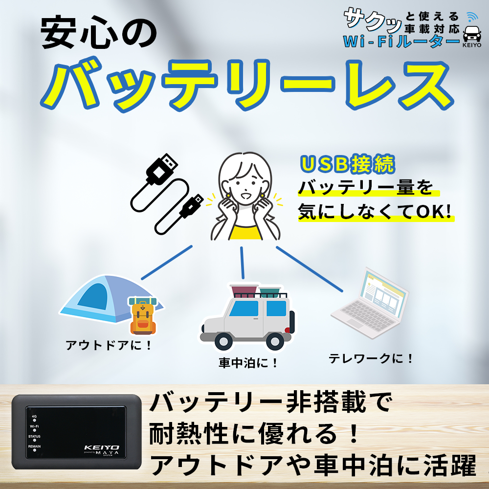 またバッテリーを搭載していないので、車内に置いたままでも安心してご使用できます。テレワーク、外出先、アウトドア等、USB電源さえあればどこでも気軽に使える超小型の持ち運びタイプになっております。もちろん停車中もWi-Fiを継続して使用できる製品となっております。