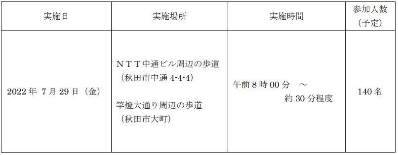 NTT東日本秋田支店(支店長 澤村 誉)を始めとするNTT秋田グループでは、社会貢献活動の一環として、秋田市中通のNTT中通ビル周辺及び秋田市大町の竿燈大通り周辺で「環境クリーン作戦」(清掃活動)を実施いたします。