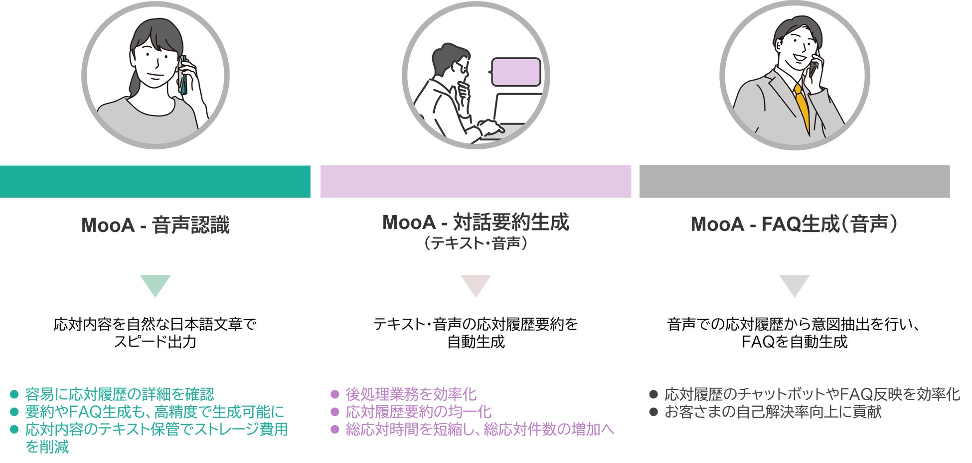 その第一弾として、このたび生成AIによる音声認識や要約・意図抽出を活用した「MooA – 音声認識」「MooA – 対話要約生成(テキスト・音声)」「MooA – FAQ生成(音声)」をリリースし、サービス提供を開始します。
