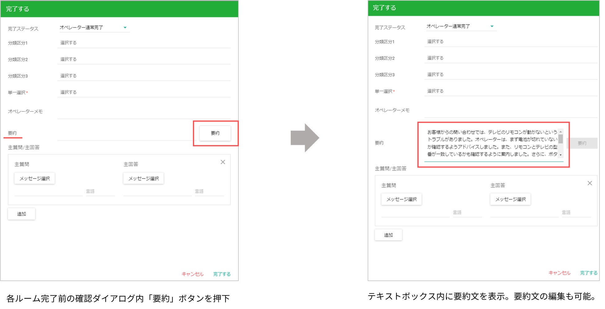 オペレーター管理画面内に直観的に操作しやすい「要約」ボタンおよび「結果の表示画面」を追加。