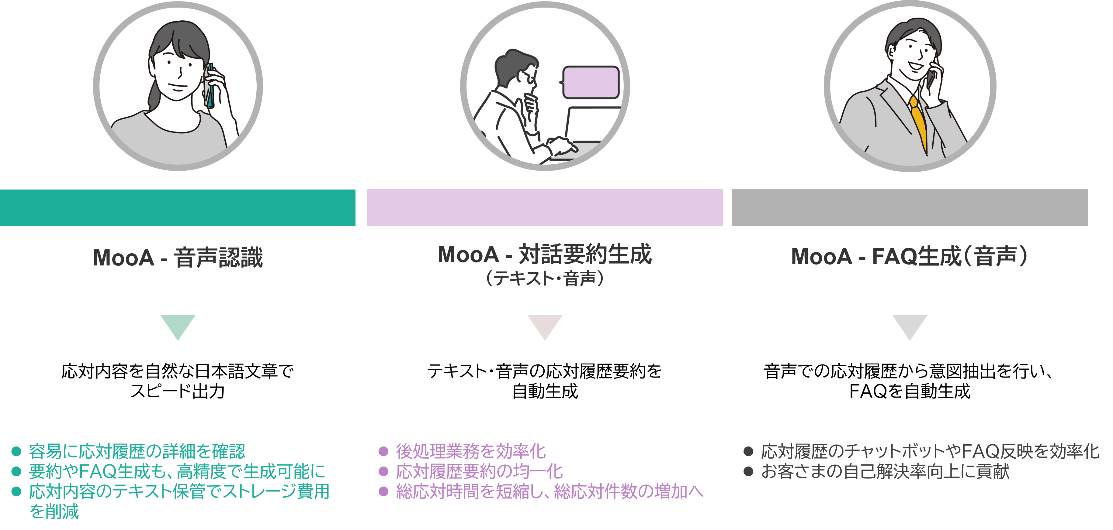 その第一弾として、このたび生成AIによる音声認識や要約・意図抽出を活用した「MooA – 音声認識」「MooA – 対話要約生成(テキスト・音声)」「MooA – FAQ生成(音声)」をリリースし、サービス提供を開始します。