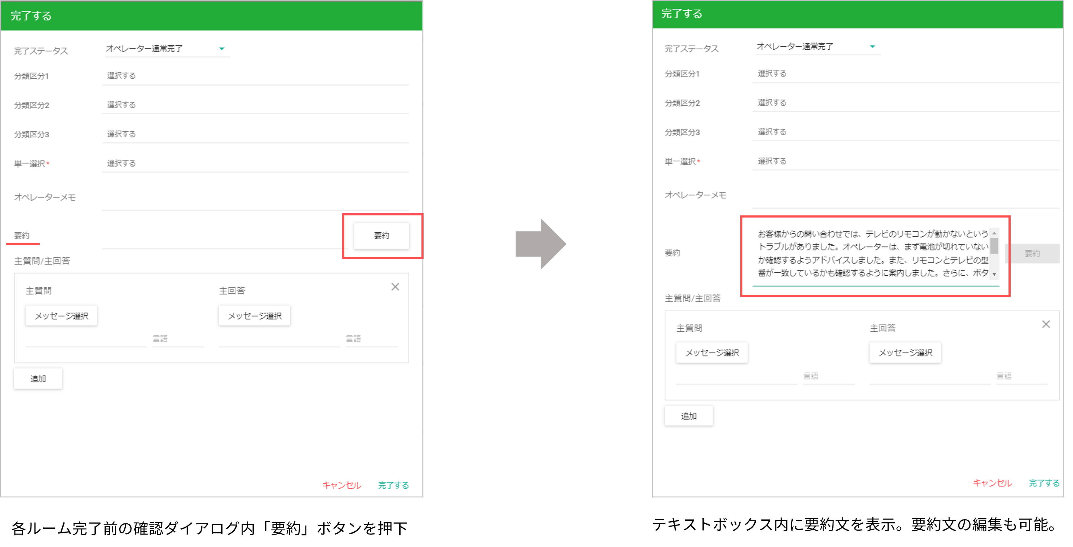 オペレーター管理画面内に直観的に操作しやすい「要約」ボタンおよび「結果の表示画面」を追加。