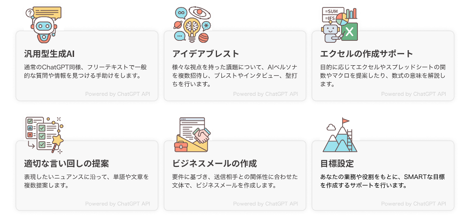 多くの企業様で必要とされる、ビジネスメールの作成・議事録作成・Excelのサポートといった活用用途別の「スキル(機能)」を準備しました。業務活用の目的に応じて「スキル」を選べば、一から質問文章を考えずとも、簡単に望んだ回答を得られます。