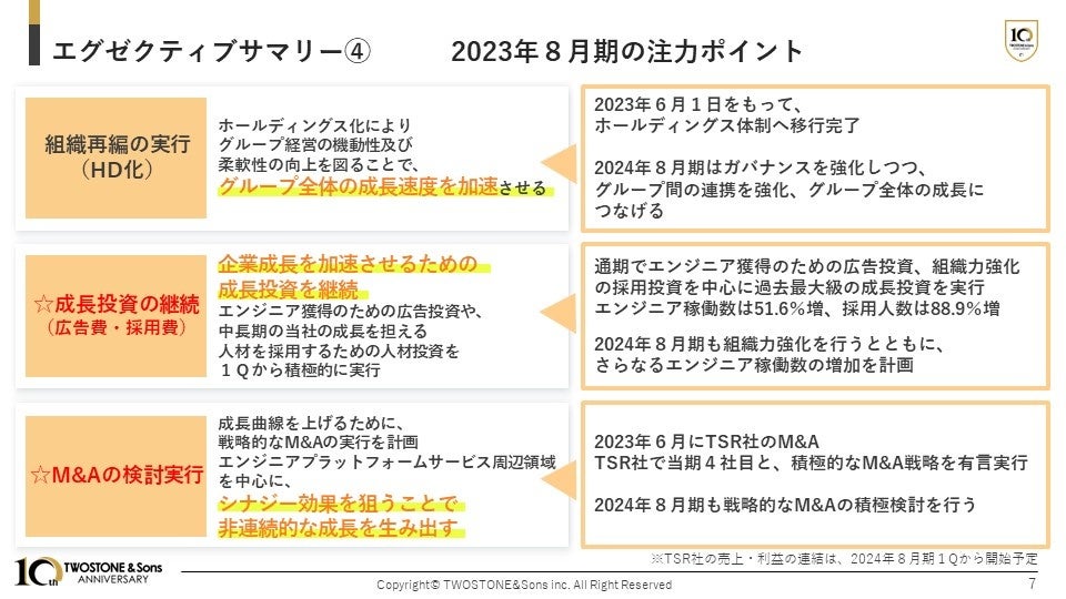 2023年8月期は、組織再編の実行、成長投資の継続、M&Aの検討実行の3点を注力ポイントとしてまいりました。