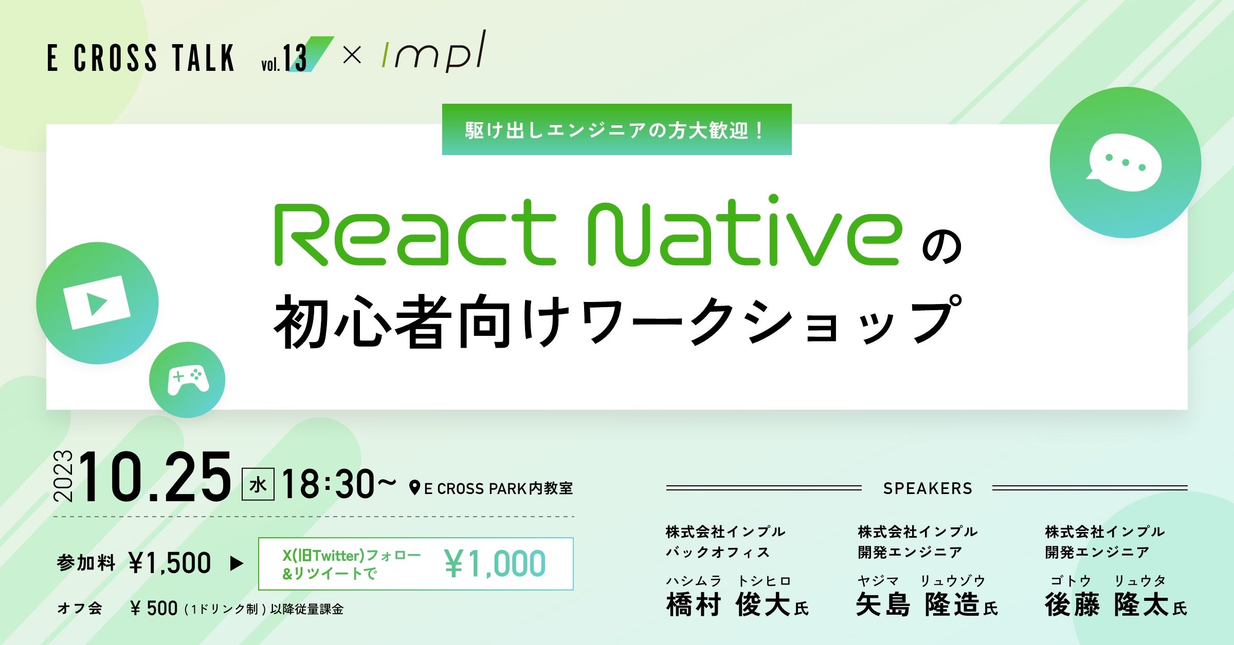 25日は「React Nativeの初心者向けワークショップ」として、クロスプラットフォームのアプリ開発用フレームワークであるReact Nativeのワークショップを開催。講師として株式会社インプルの橋村 俊大氏、矢島 隆造氏、後藤 隆太氏が登壇します。