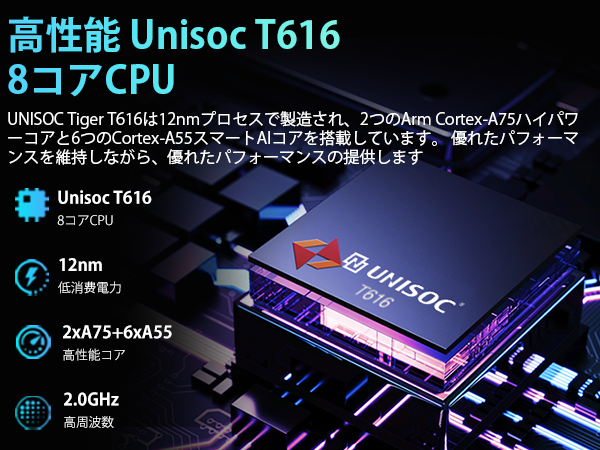 12nmプロセスの8コアUNISOC T616高速プロセッサーを搭載し、A75アーキテクチャーのコアを採用、最大2.0Ghzの周波数をサポートする。 強力なMali G57ゲーミンググレードグラフィックスプロセッサーを搭載し、日々のエンターテインメント用途の需要に応えることができる。