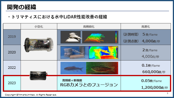 本コンソーシアムでは、水中をモニタリングするために光無線技術のLiDARをコア技術として研究してきました。現在、水中のモニタリングをより一層図るため、LiDARとカメラを組み合わせた新技術の開発がトリマティス株式会社にて進行しています。本技術は従来にはなかった、RGB三色レーザ搭載LiDARの使用と LiDARとカメラの同時搭載かつハード的に融合しているという点で世界初の技術となっており、現在この「水中フュージョンカメラ」技術について特許出願をしています。