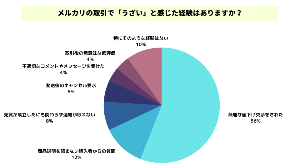 最も多かった「うざい」と感じる経験は「無理な値下げ交渉をされた」という回答で、全体の56%を占めています。次に「商品説明を読まない購入者からの質問」が12%と続きます。