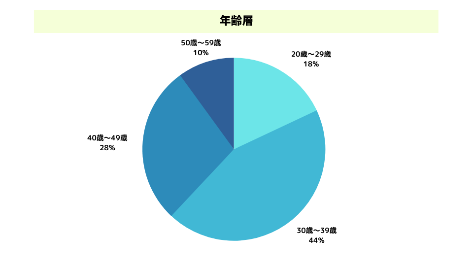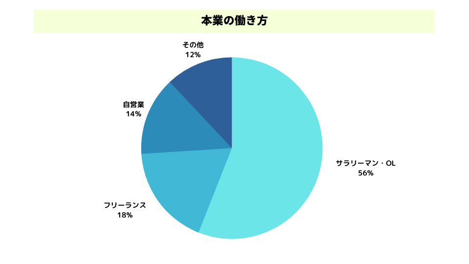 今回アンケートを取った結果、性別、年齢層、本業の働き方 の割合は以下の内訳となりました。