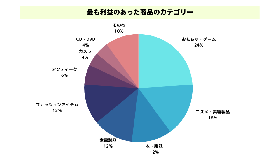 メルカリでの取引において「おもちゃ・ゲーム」が特に利益を上げやすいカテゴリーとして挙げられています。また、「コスメ・美容製品」も相当数の人々が利益を上げていることが示されています。