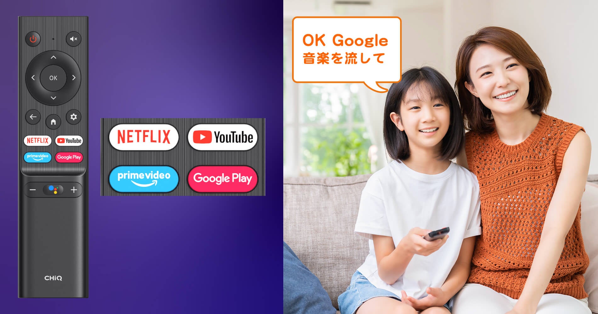 リモコンにはダイレクトボタンとGoogleアシスタントボタンが付いており、かんたんに操作することができます。ダイレクトボタンを押すとYouTube 、Netflix、Amazonプライムビデオ、Google Playストアにすぐに繋げることができ、見たいコンテンツに手早くアクセスできます。また、Googleアシスタントボタンを押すことで音声入力が起動し、映画や番組を探したり、気分にあったオススメを尋ねたりといった様々な操作が声だけで可能となります。