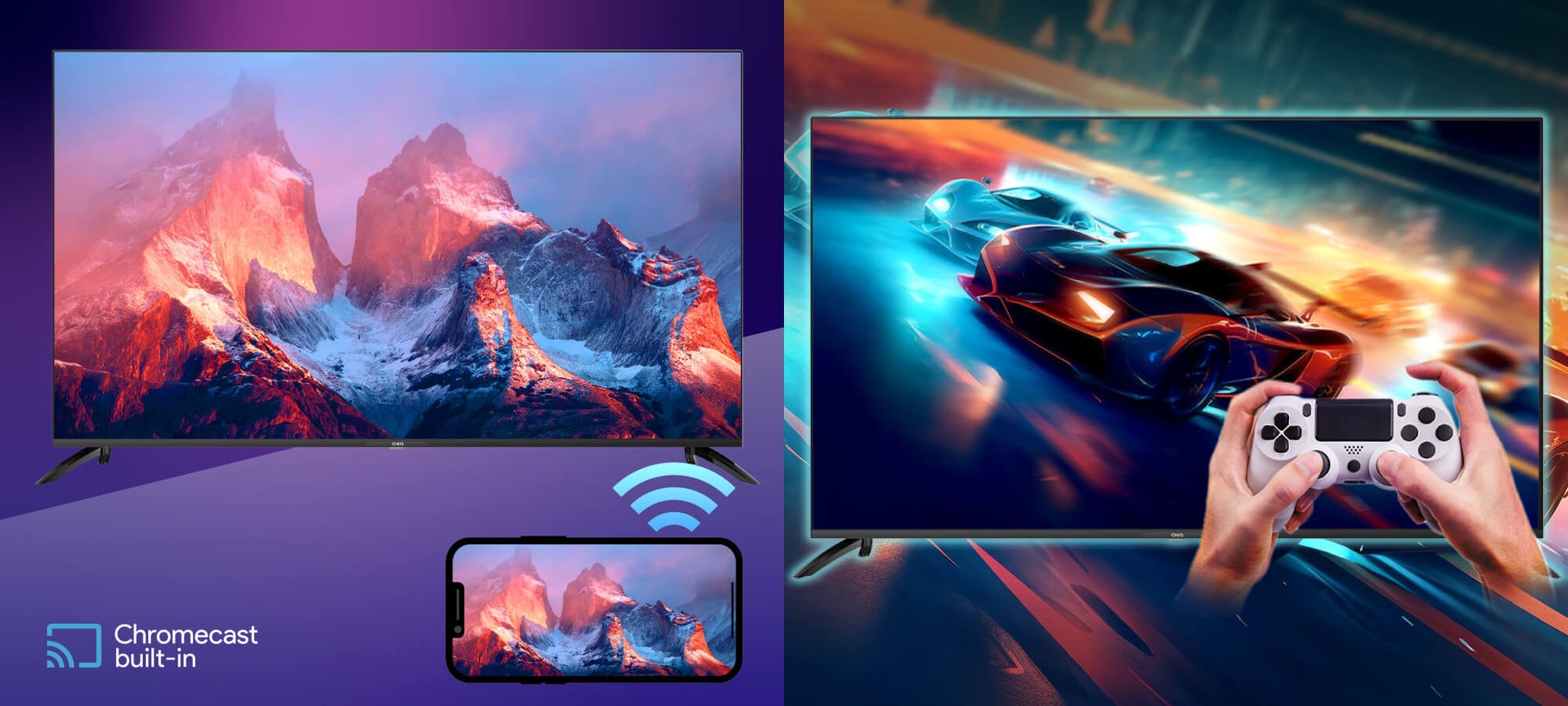 本体に内蔵されているChromecastを使用することで、スマートフォンやタブレットなどの画面を、簡単にテレビに映し出すことができます。今までデバイスの小さい画面で見ていた写真・動画・ゲームの映像を、迫力ある大画面でお手軽にお楽しみいただけます。