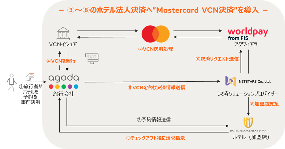 Agodaは、旅行者の予約・チェックアウト情報を元にVCN*1を発行のうえ、NETSTARSのストレートスループロセッシングを通じて、ホテルへ決済処理を提供するので、ホテルは手作業を介さずに直接バーチャルカード決済を受け取ることが可能になります。これにより、ホテルは、請求プロセスにおける人為的なミスの削減および業務の効率化を促進することができ、未回収リスクも軽減できるので生産性の向上に貢献します。