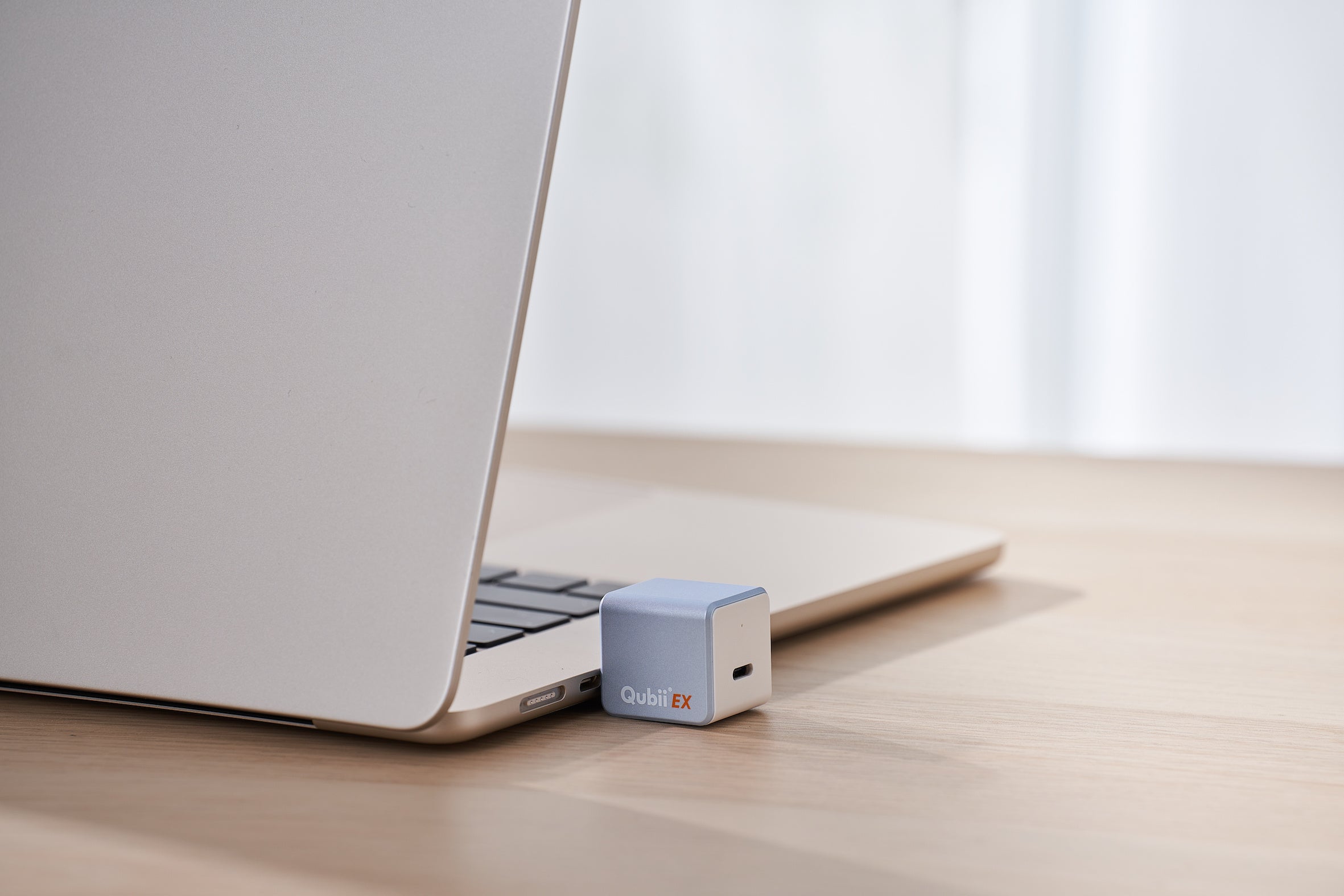 「Qubii EX」はPCに直接接続してデータの転送が可能、4GB以上の動画/オーディオファイルをネット接続不要でPCに転送することが出来ます。USB-C 3.2を採用し前モデルに比べて転送速度が2倍以上アップしました。