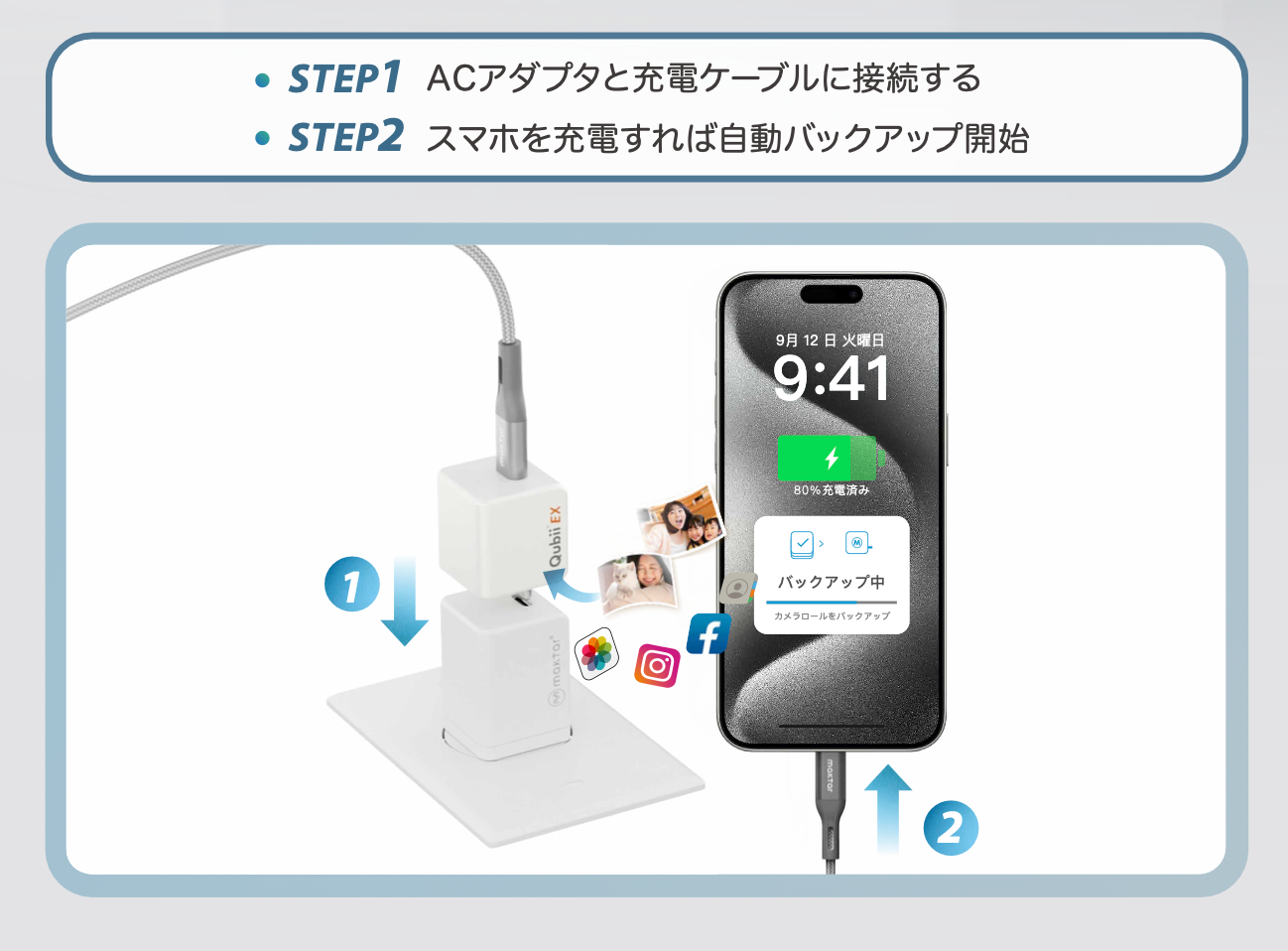 「Qubii EX」は、充電しながらスマホをバックアップする「Qubii」シリーズの最新モデル。ハイグレード高速メモリを内蔵し、前モデルと比較してバックアップスピードが20%アップしています。また、iPhone15シリーズの新しい充電規格にも対応、最大60WのPD急速充電が可能で、データバックアップ中も充電スピードは減速しません。