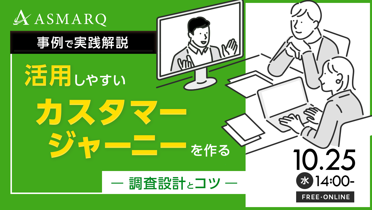そこで今回は、リサーチのプロが有益なカスタマージャーニーを作るための「調査設計」について、準備段階~分析ステップまでをレクチャーします。セミナーでは「アスマーク」の事例を基に、実践形式で調査設計のコツとポイントをお届け。この機会に是非、自社戦略におけるカスタマージャーニー設計の精度が高まる、リサーチのフレームをご理解いただけますと幸いです。