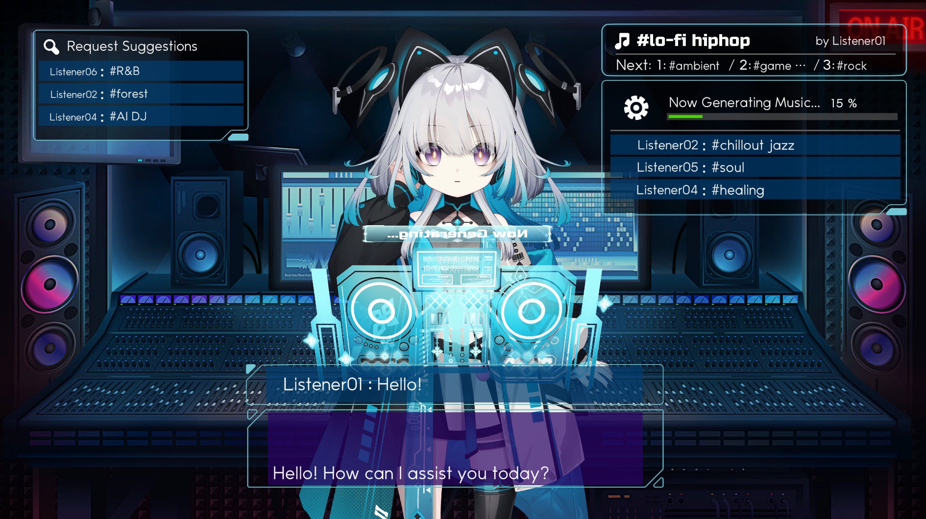 AI DJ Vtuber「DAJI(ダジ)」は音楽生成ツールが搭載されていて、視聴者の皆さまのリアクションコメントをもとに、オリジナルの音楽をジャンル問わず、リアルタイムで生成します。DAJIがお届けする唯一無二の音楽をぜひお楽しみください。