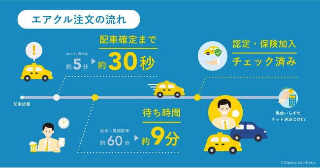 エアクルでは、利⽤者がスマホやタブレットから配⾞発注をすると、運転代⾏業者と利⽤者の位置情報を活⽤し、効率的なアルゴリズムにより最適な配車を⾏います。アプリによる配車は平均30秒、平均到着時間は9分となり、従来と比較すると約80%以上の時間短縮に成功し、今までにない配車体験と業務改善を実現しました。