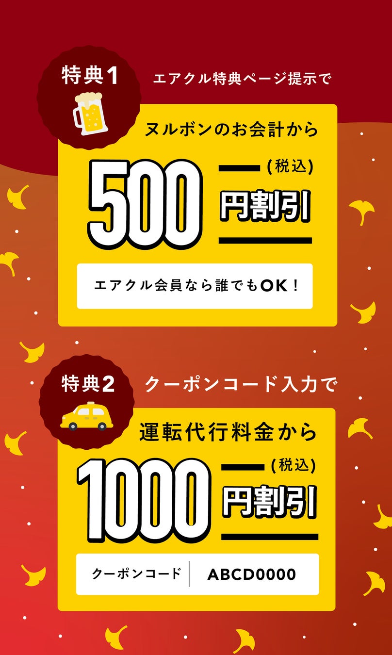 内容:エアクル会員ならヌルボングループの対象店舗で会計から500円割引