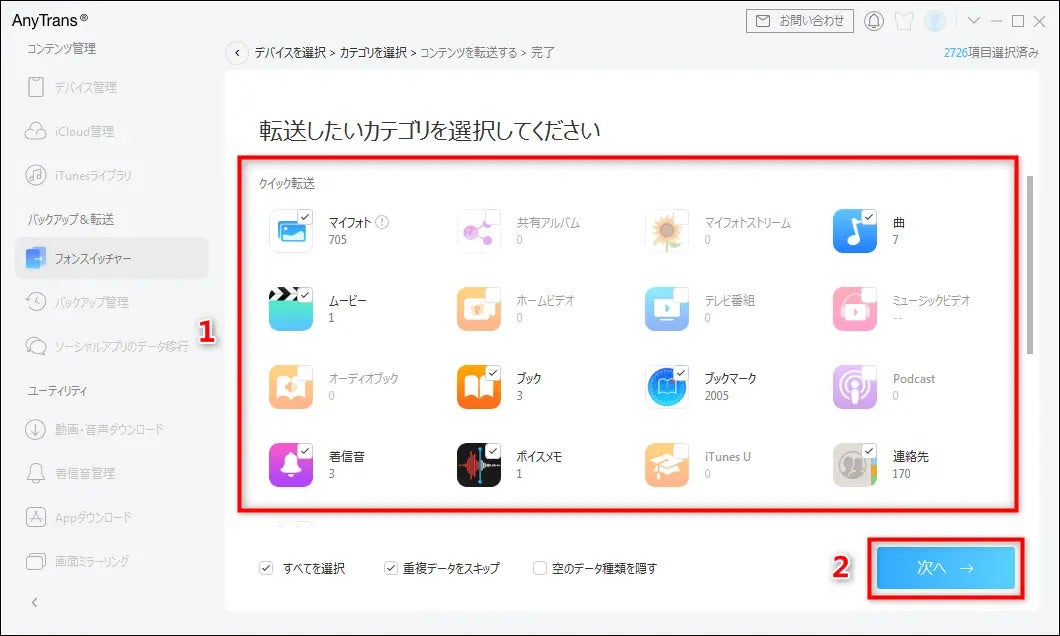 Step 5.移行したい重要なデータを選択し、「次へ」ボタンを選択します。