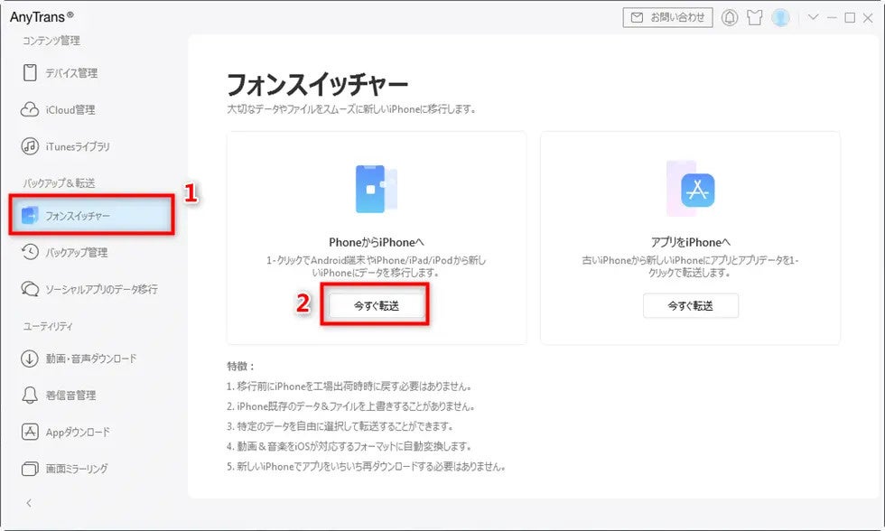 上記のコンテンツは、iPhoneのクイックスタートという機能の定義、そして、クイックスタートでデータを移行できないの原因と解決方法を紹介していますので、ご自身のニーズに合わせて問題を解決するように注意してください。また、データーの移行の際には、AnyTransというソフトウェアを試してみることを強くお勧めします。安全性が高いので、安心してご利用いただけます。お役に立てれば幸いです。