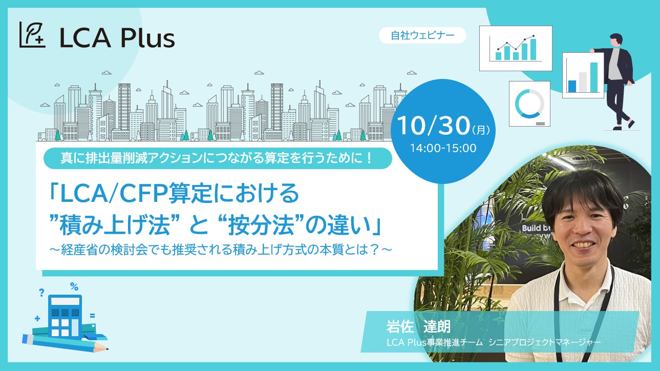 2023年6月2日(金)に開催しました「LCA/CFP算定における”積み上げ法”と”按分法”の違い」ウェビナーは、多くの皆さまからご好評いただき、また、ご予定の合わなかった皆さまから追加開催のご要望をいただいたことを受け、2023年10月30日(月)に再度開催させていただくこととなりました。