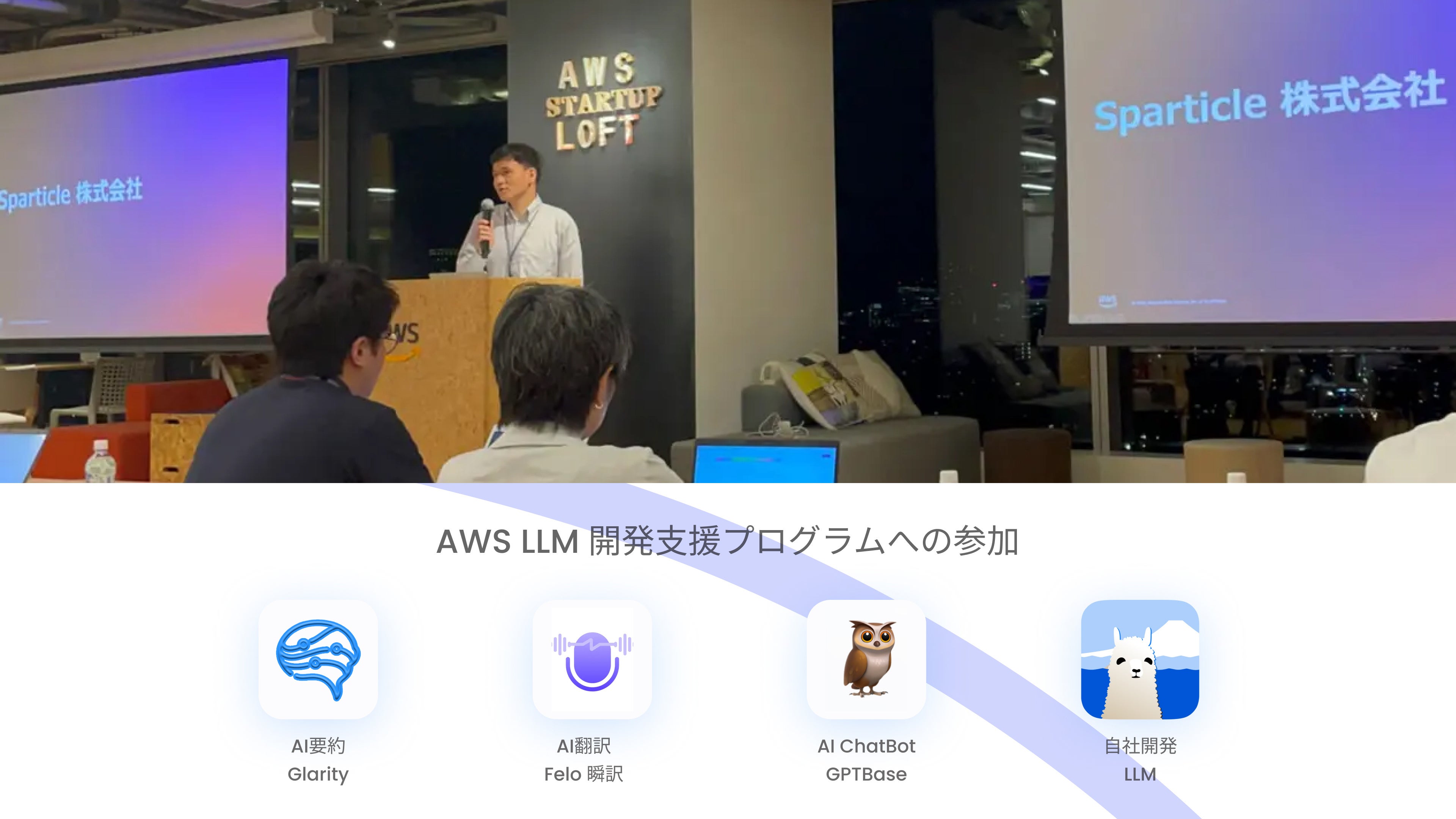 2019年の創業以来、Sparticle株式会社は、情報要約ツール「Glarity」、リアルタイム通訳アプリ「Felo瞬訳」、ナレッジデータベースによるAIチャットポッド「GPTBase」など、多様なAI製品の開発と提供に取り組んでいます。2023年にはAWS LLM開発支援プログラムに採択され、日本語理解能力の向上に取り組むことで、企業向けに高い安全性と信頼性を備えた生成用AI製品を提供しています。