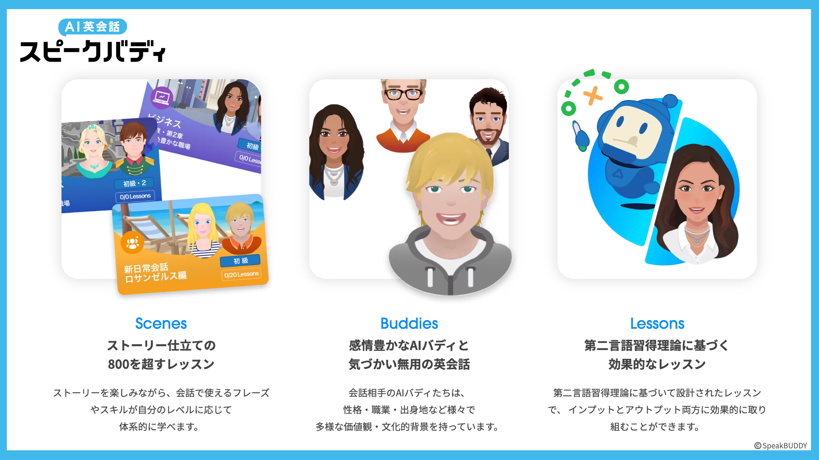 AIを活用し英会話を習得するスマートフォンアプリ。「人間の講師」を介さず、「AIバディ(キャラクター)」との対話を通じて、会話表現を習得していく。音声認識・会話AI・自然言語処理・機械学習などの技術を活用してスムーズな会話を実現している。講師予約や移動が不要な上、オリジナル教材は全てアプリ内で配信されるため、時間や場所を問わずスマホ一つで学習が完結し、利便性が高い。
