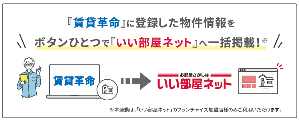 今回のリリースにより、「いい部屋ネット」のフランチャイズに加盟されている不動産会社様は「賃貸革命10」に登録されている物件情報を「いい部屋ネット」へシームレスに掲載することが可能となり、業務効率の向上と入力ミスの削減に繋がります。