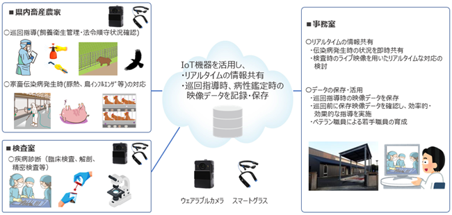 IoT機器の導入による検討事項の検証を実施し、強いては地域における家畜衛生の更なる向上をめざす神奈川県と連携し、NTT東日本は、ウェアラブル映像端末を活用したDXによる職員業務の効率化および省力化、家畜衛生の向上を図る実証実験を開始するに至りました。