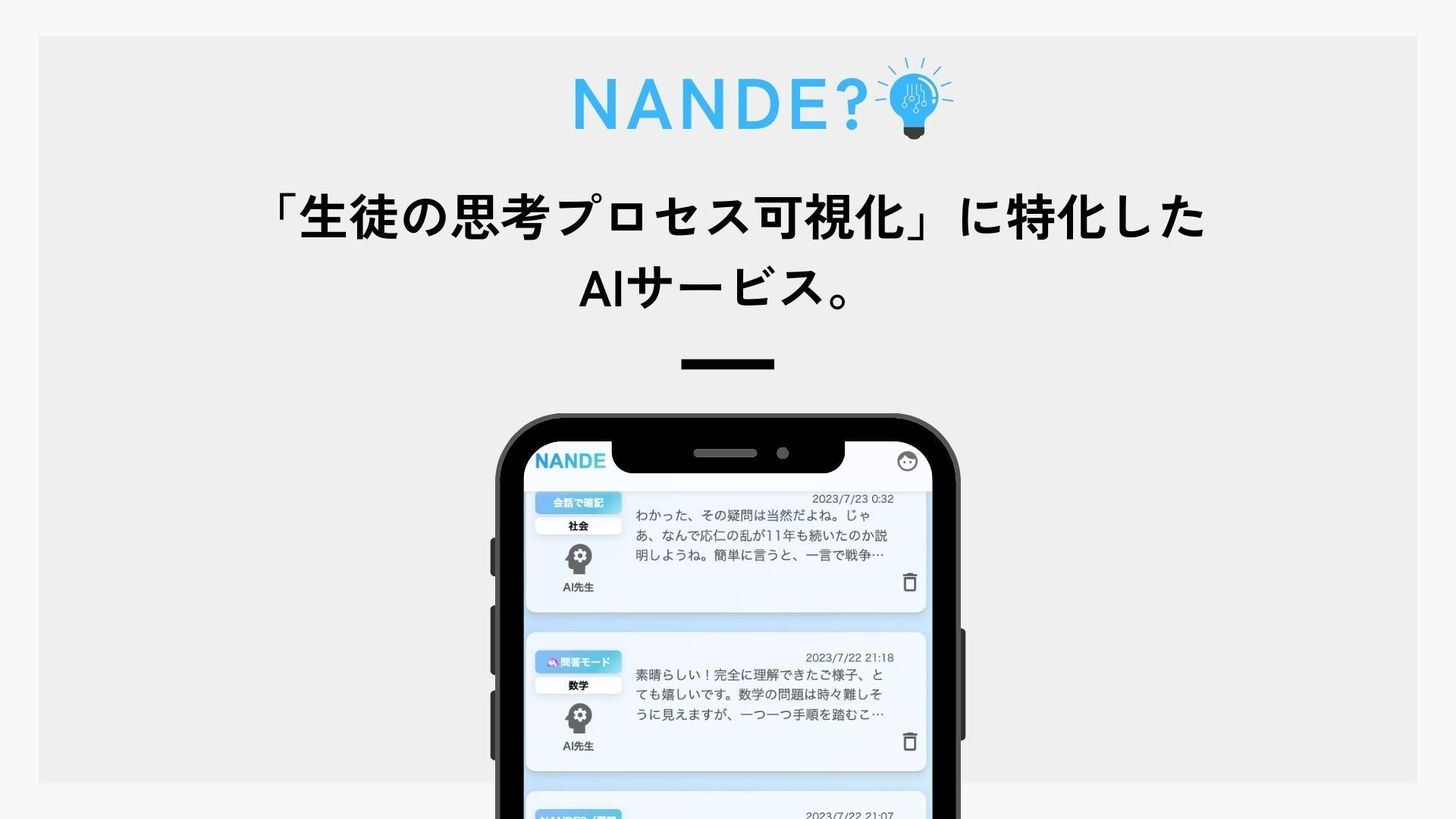 答えを教えず、答えに導くソクラテス問答法を導入した全く新しい学習ツール【NANDE】は、生徒の思考プロセスを可視化できるツールです。