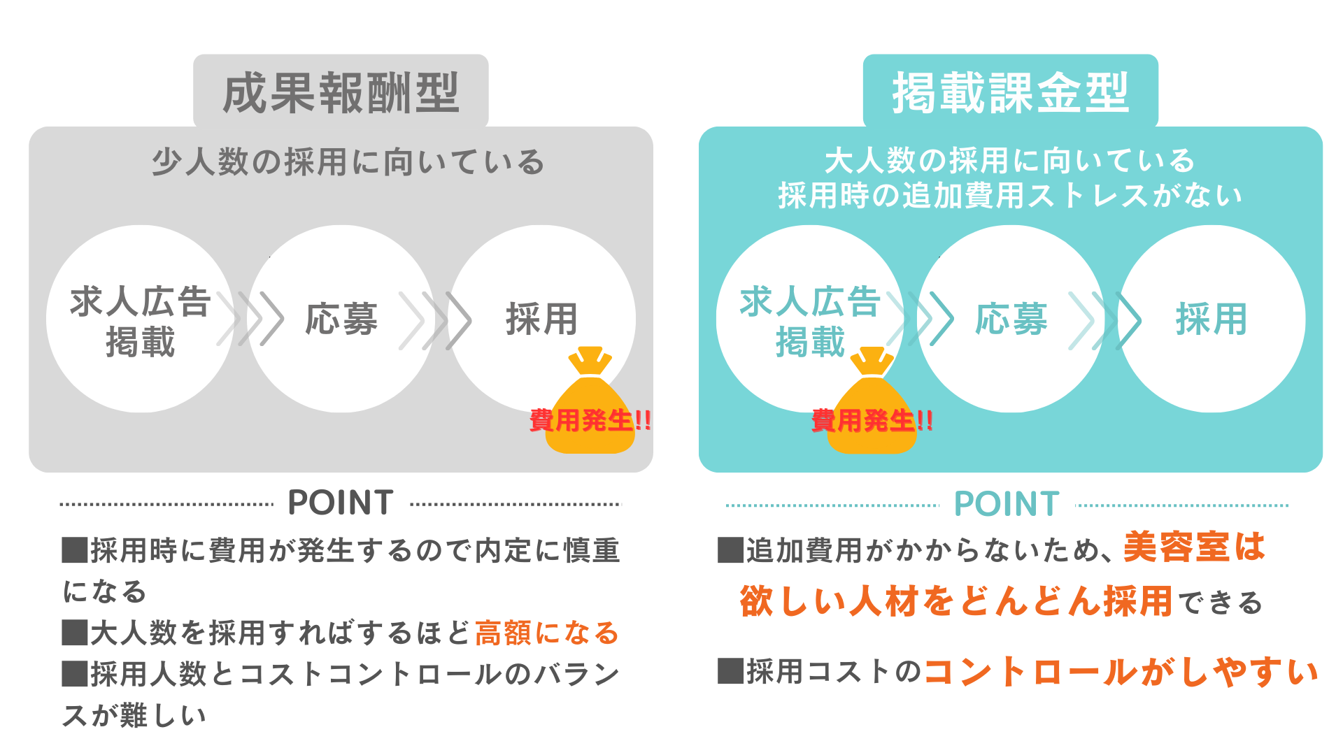 美容業界の求人情報サイトは【成果報酬型】が多いなか、「リクエストQJ ナビ」は【掲載課金型】を採用しています。