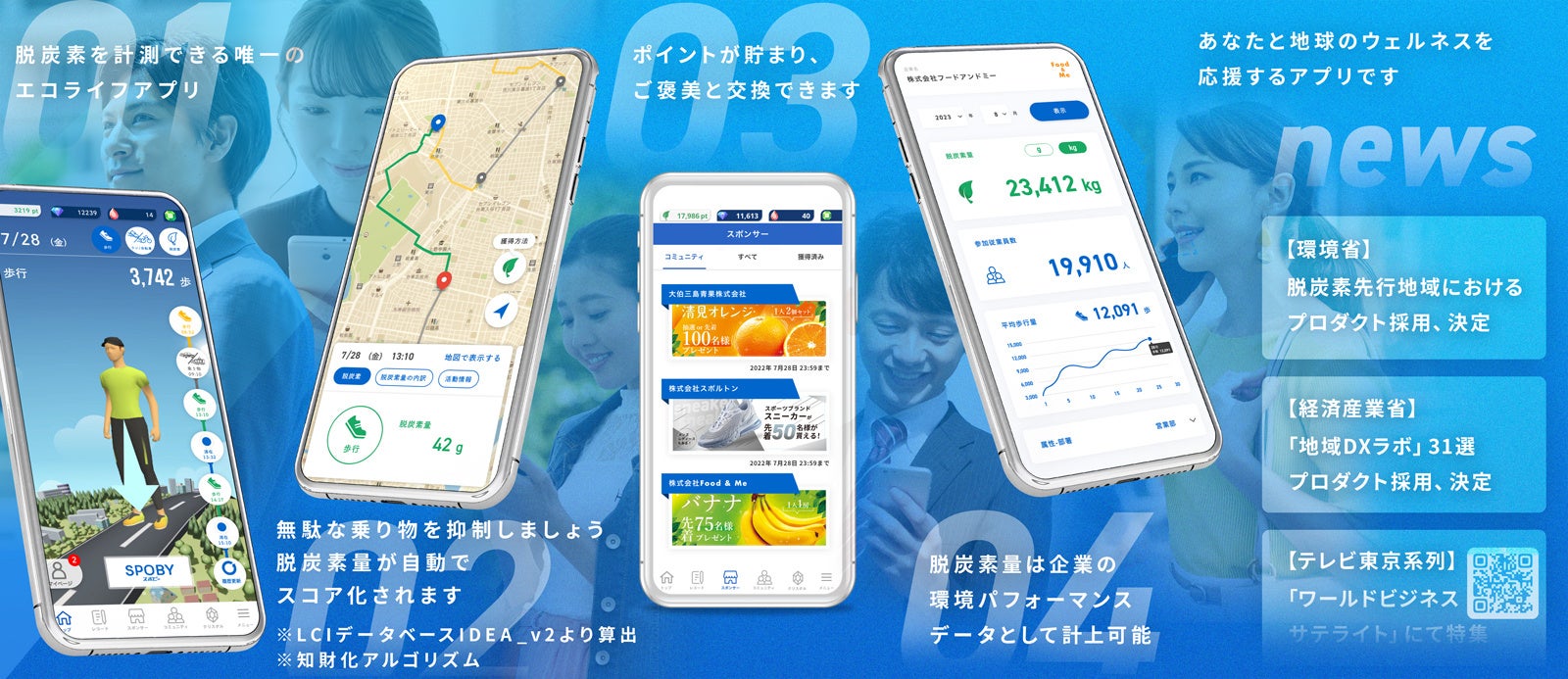 「SPOBY」は、本来乗り物に乗って移動すべき距離間を歩行や自転車で代替移動した場合に節約できたCO2排出量を脱炭素量として可視定量化するスマートフォンアプリケーションです。