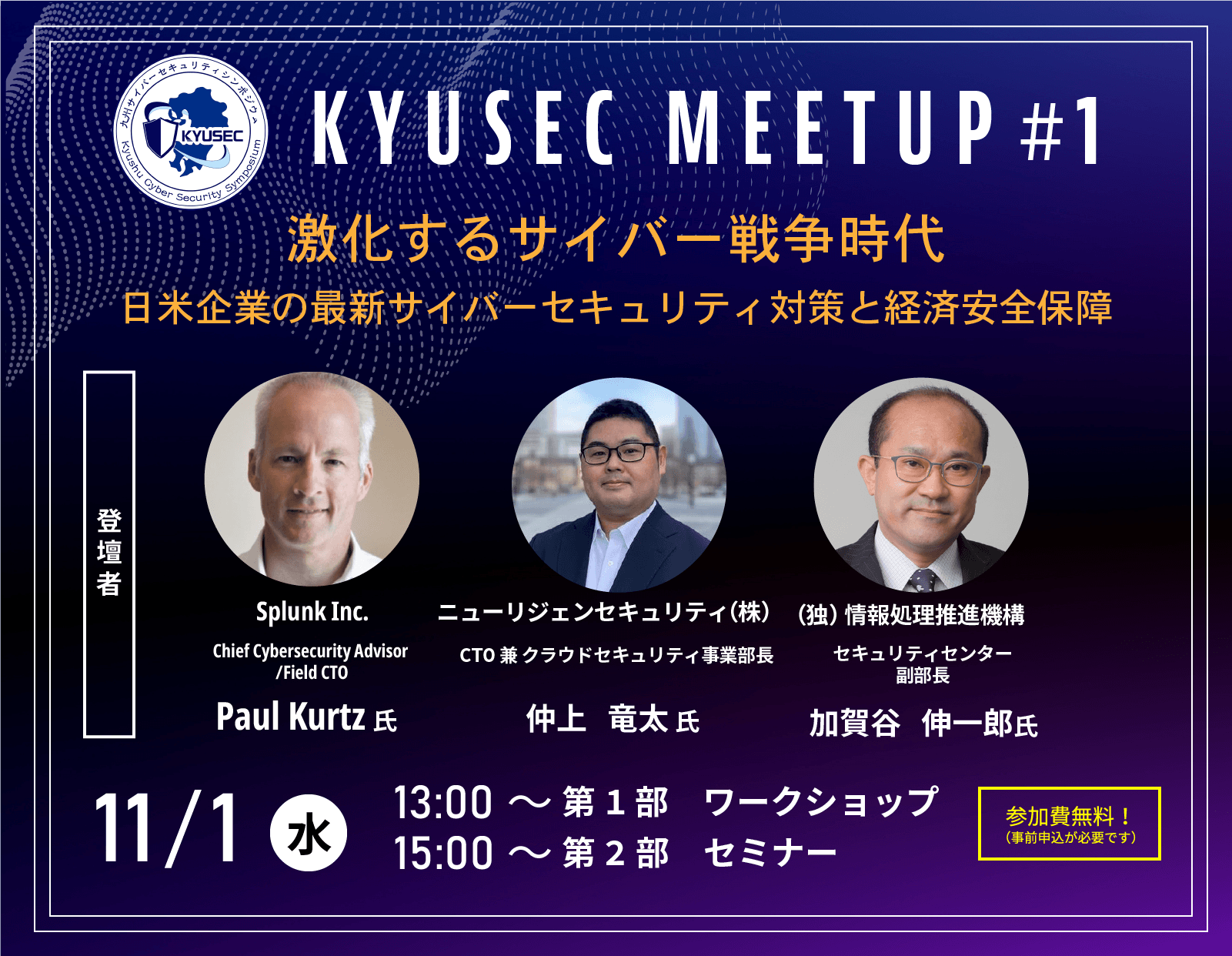 本イベント『KYUSEC MEETUP #1』では、「激化するサイバー戦争時代~日米企業の最新サイバーセキュリティ対策動向と経済安全保障~」をテーマに、米国から元 ホワイトハウス国家安全保障会議 大統領特別補佐官Paul Kurtz(ポール・カーツ)氏をはじめ、日米のサイバーセキュリティ最前線で活躍中の専門家が登壇し、最新のサイバーセキュリティ対策事情について講演いたします。