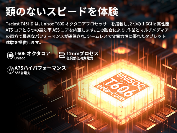 Teclast T45HDは、Unisoc T606オクタコアプロセッサーを搭載し、2つの1.8GHz高性能A75コアと6つの高効率A55コアを内蔵します。この融合により、作業とマルチメディアの両方で最適なパフォーマンスが確保され、シームレスで省電力性に優れたタブレット体験を提供します。