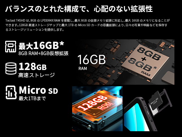 Teclast T45HDは、8GBのLPDDR4X RAMを搭載し、最大8GBの仮想メモリ拡張に対応し、最大16GBのメモリになることができます。128GB高速ストレージチップと最大1TBのMicro SDカードの容量拡張により、日々の写真や映画などを保存するストレージソリューションを提供します。