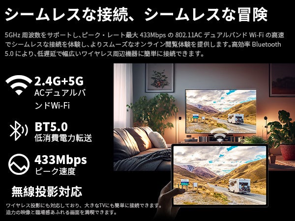 5GHz周波数をサポートし、ピーク・レート最大433Mbpsの802.11ACデュアルバンドWi-Fiの高速でシームレスな接続を体験し、よりスムーズなオンライン閲覧体験を提供します。高効率Bluetooth 5.0により、低遅延で幅広いワイヤレス周辺機器に簡単に接続できます。