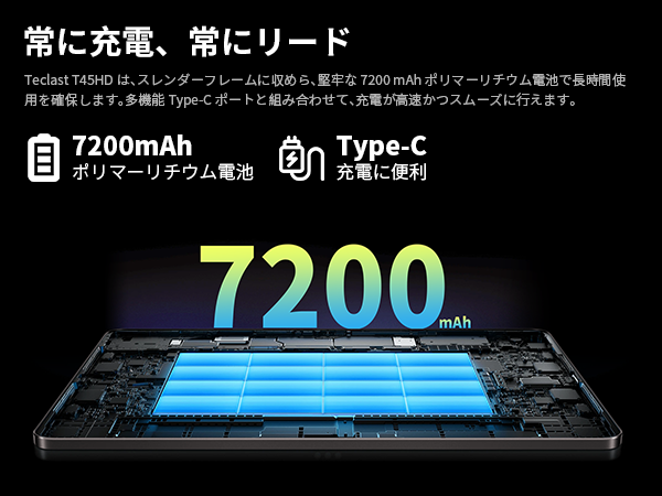 Teclast T45HDは、スレンダーフレームに収めら、堅牢な7200 mAhポリマーリチウム電池で長時間使用を確保します。多機能Type-Cポートと組み合わせて、充電が高速かつスムーズに行えます。