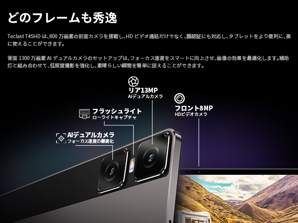 Teclast T45HDは、800万画素の前面カメラを搭載し、HDビデオ通話だけでなく、顔認証にも対応し、タブレットをより便利に、楽に使えることができます。