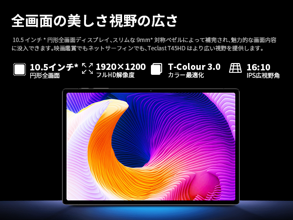 10.5インチ円形全画面ディスプレイ、スリムな9mm*対称ベゼルによって補完され、魅力的な画面内容に没入できます。映画鑑賞でもネットサーフィンでも、Teclast T45HDはより広い視野を提供します。