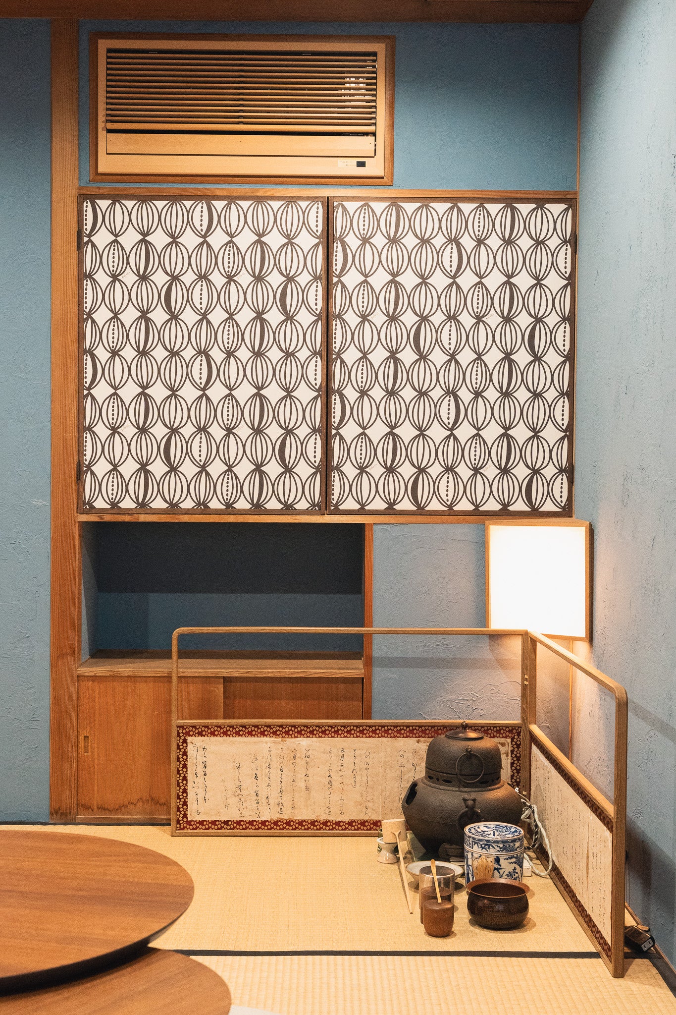 中二階に位置する京間約6畳の和室は、村野氏の息づかいが感じられる伝統的な和の空間です。自社商品である柄付きのカラフルな襖紙や室内用塗り壁材を用いたリノベーションを施し、新旧の時代が重なりあう特別な一室となっています。これまでは一般のお客様にご覧いただける機会がありませんでしたが、今後はレンタルスペースとしてご利用いただけます。